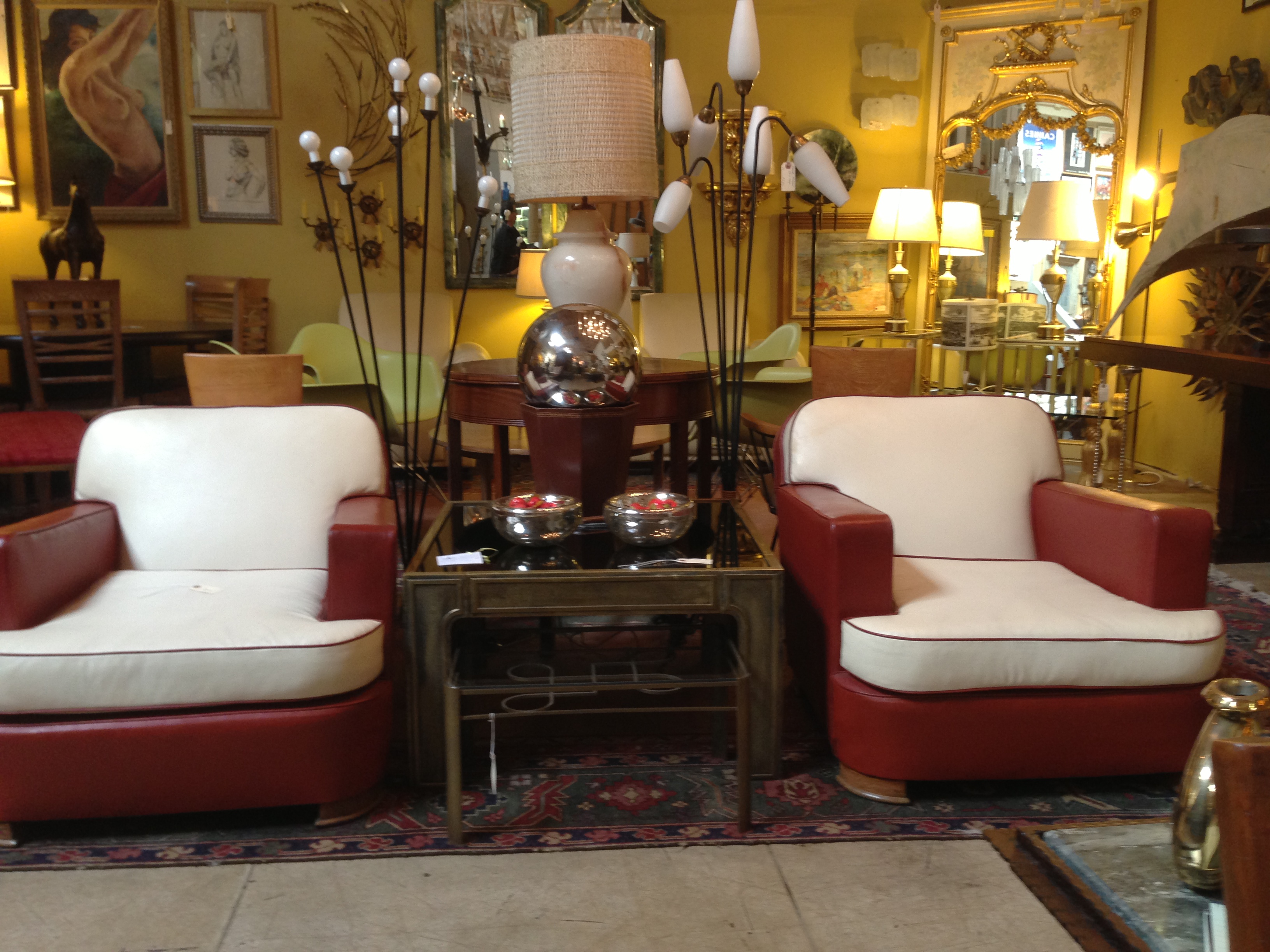 A couple of stylish Art Deco club chairs sit among an eclectic mix of furniture, wall hangings and more at Little Paris Antiques.