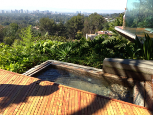 We take this in, but our eye moves to the huge glass wall that allows us to see the swimming pool and the sprawl of L.A. below. It’s a space of angles, with a concrete roof and a wood ceiling.